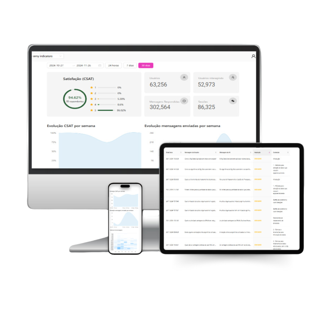 Exclusivamente treinada no seu conteúdo, responde dúvidas, facilita a busca, gera quizzes, flashcards, resumos, recomenda materiais e fornece dados e insights para melhorar a sua plataforma.